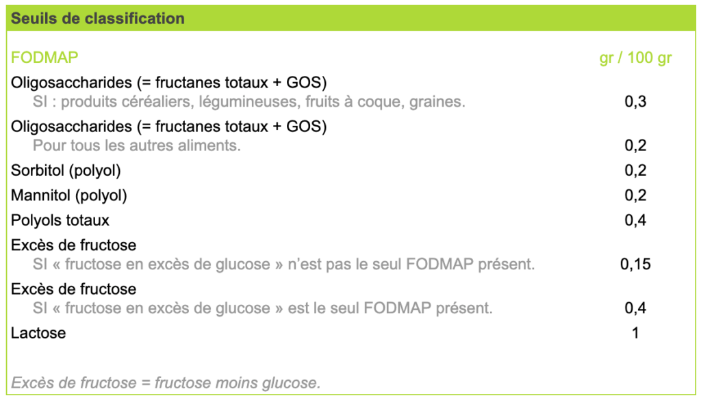 - les seuils utilisés pour classer un aliment comme « faible » ou « élevé » en FODMAP (en cohérence avec ceux définis par l’université Monash),